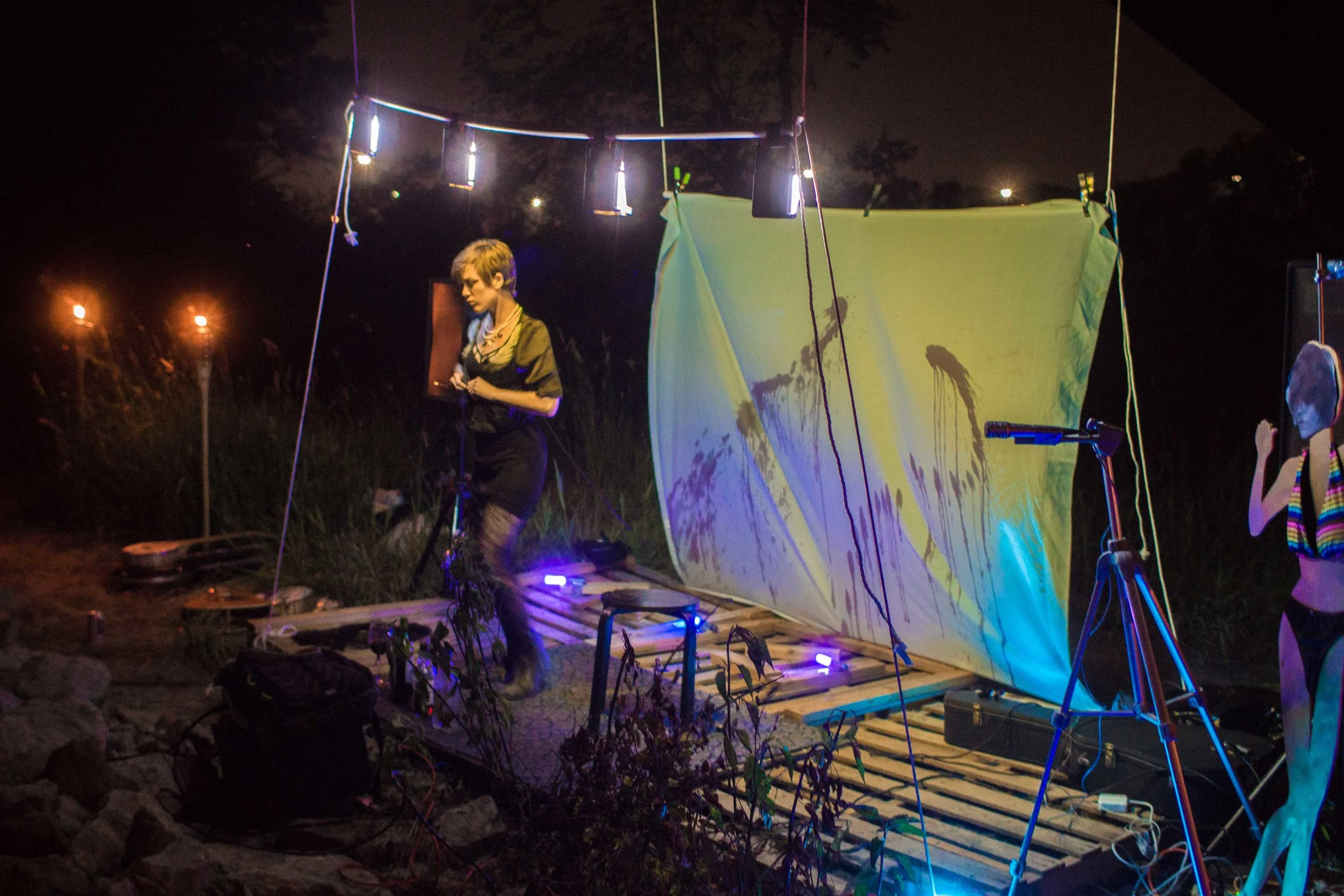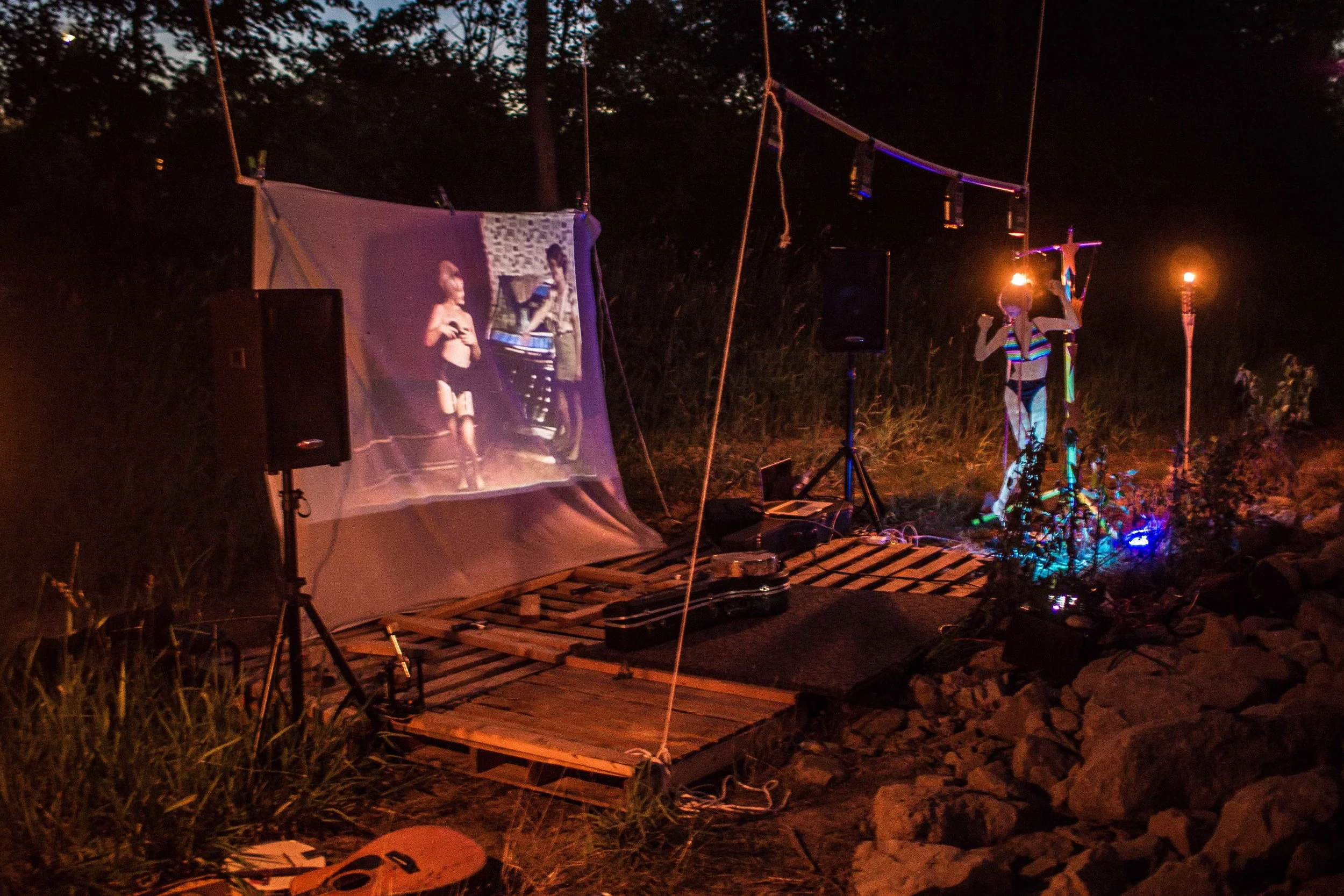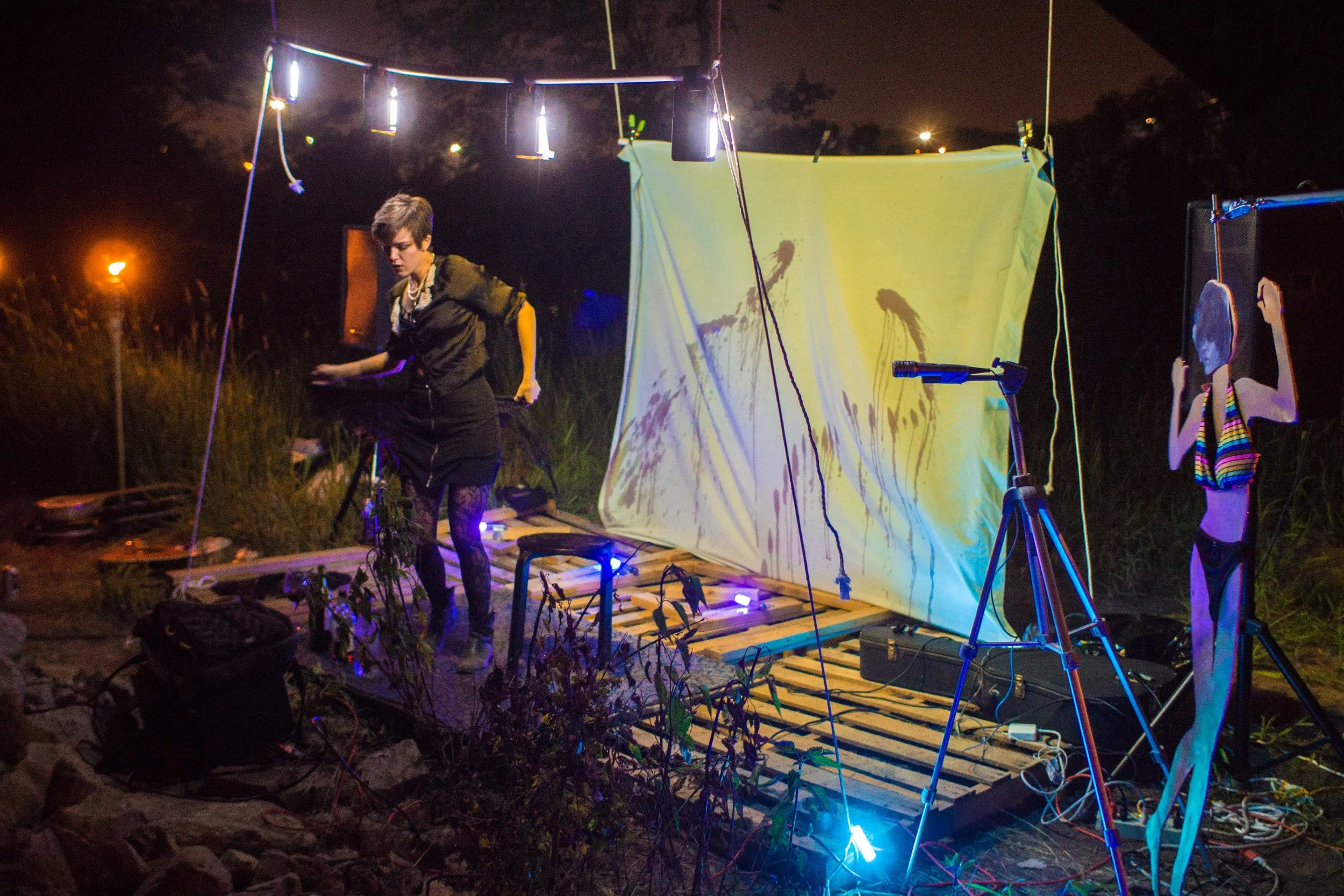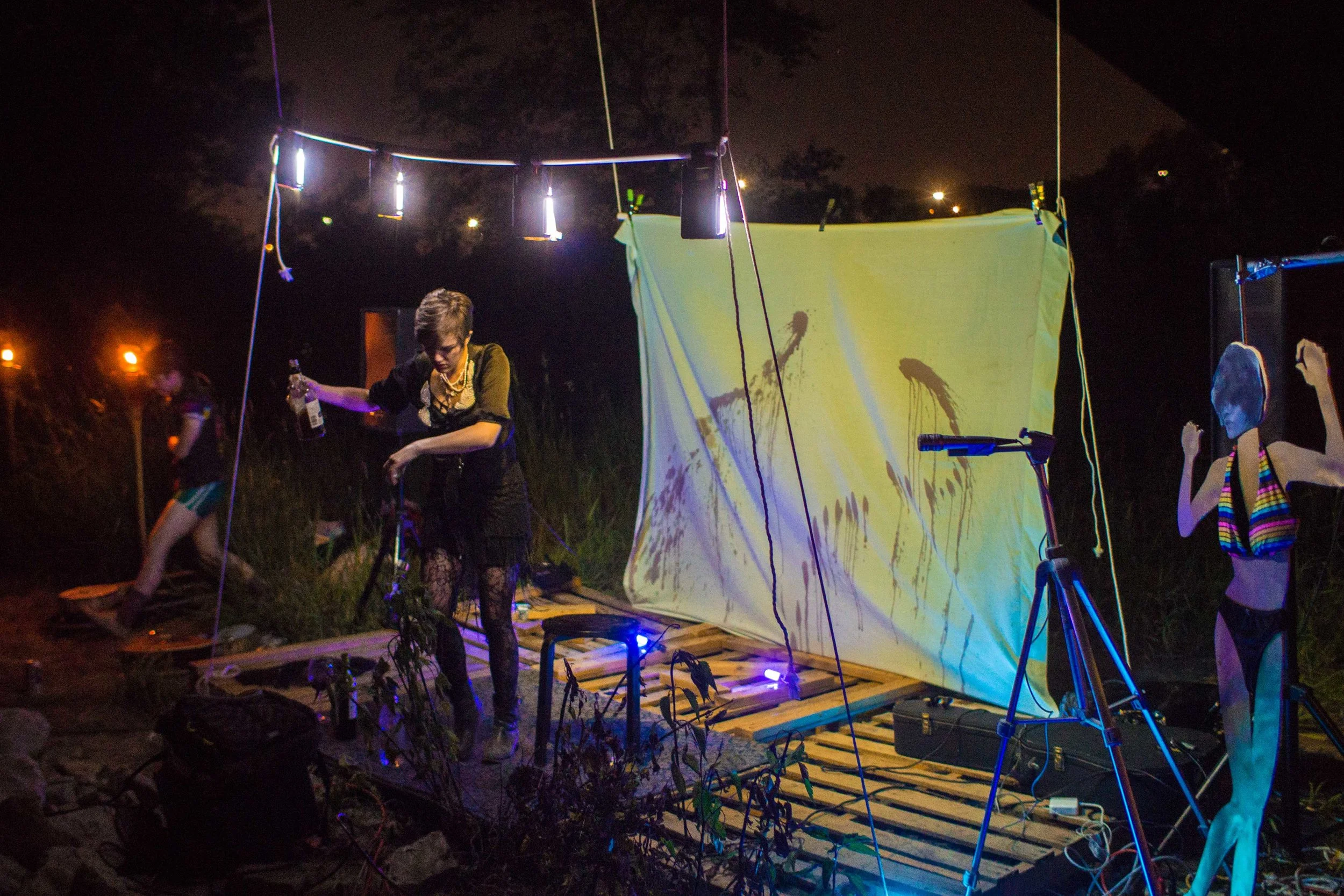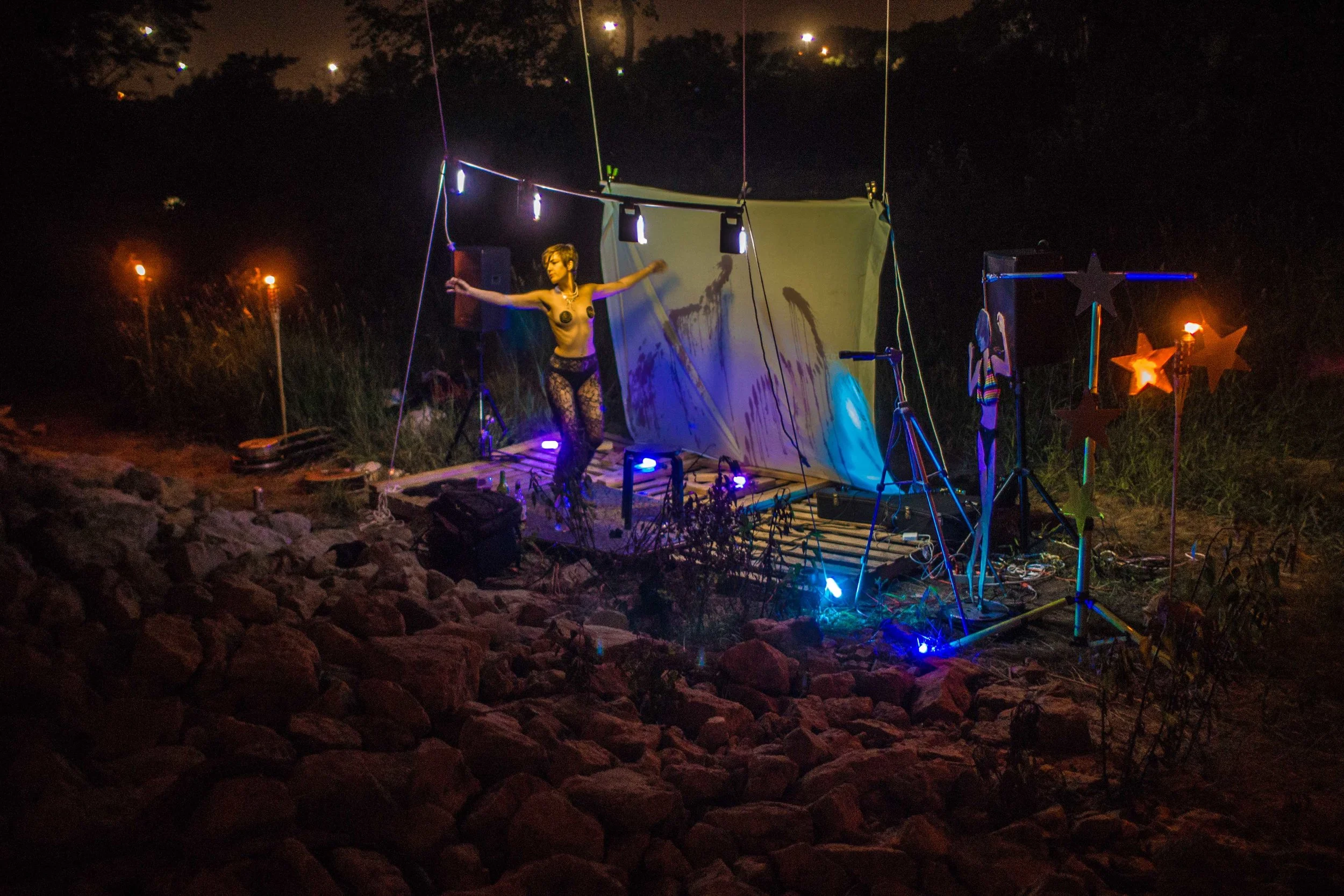 Set upon the rolling banks of the Kaw River under the belly of a derelict abandoned RR bridge BEASTS was a burlesque tribute to hobo culture. This multimedia collaborative event featured dueling banjo’s by Joseph Warren & Teri Quinn, 1960’s nudie cutie erotic shorts, and burlesque performance by the Velvet Valkyrie & Archimedes. Accompanied by golden go-go dancers spinning on broken record players and Bowie & Prince effigy the night came to a celebratory close with an impromptu wedding and cleansing fire.