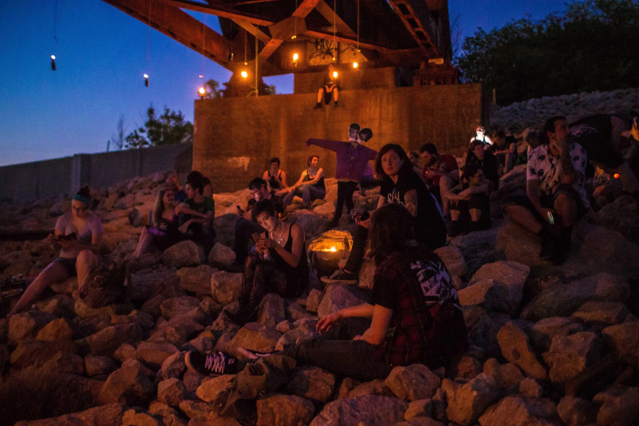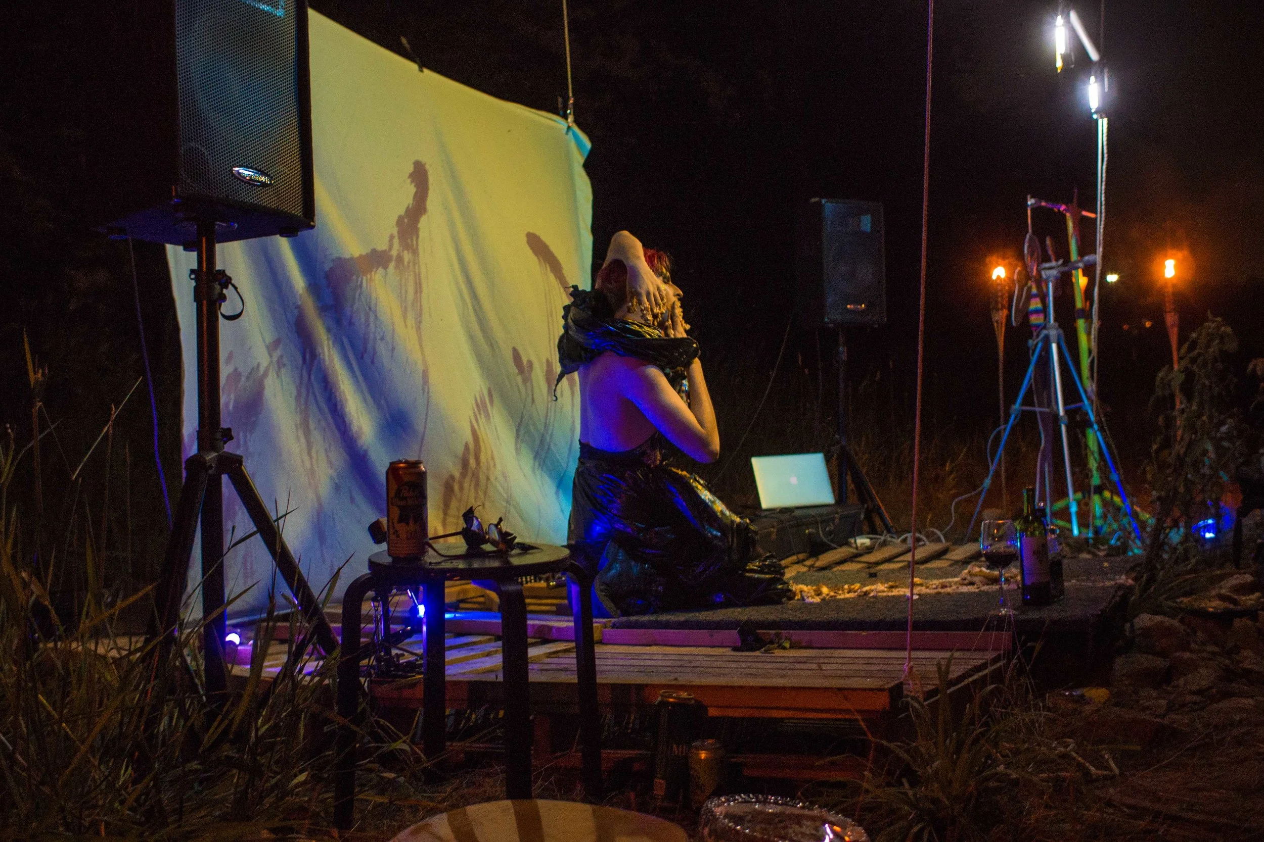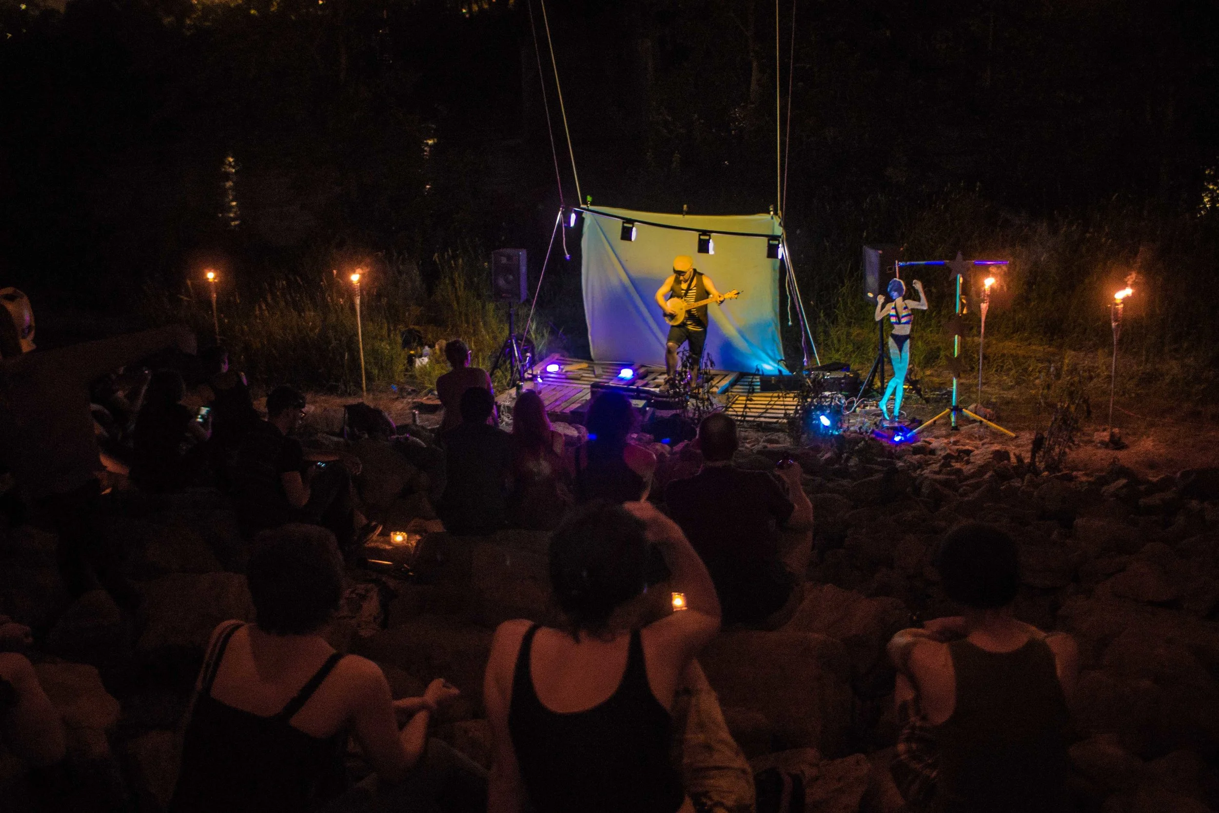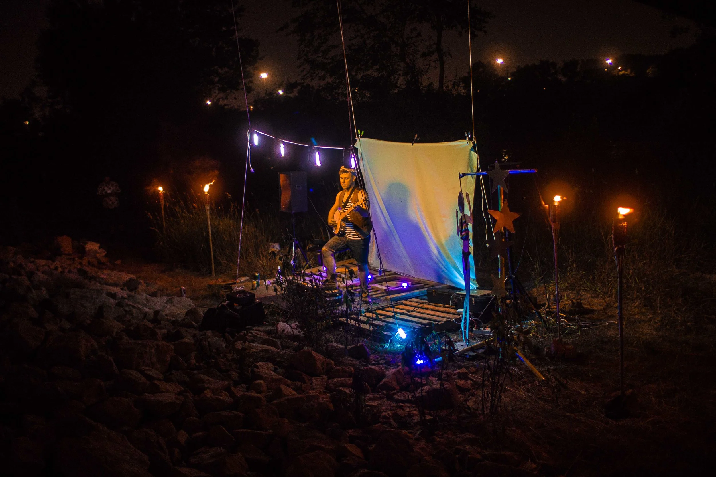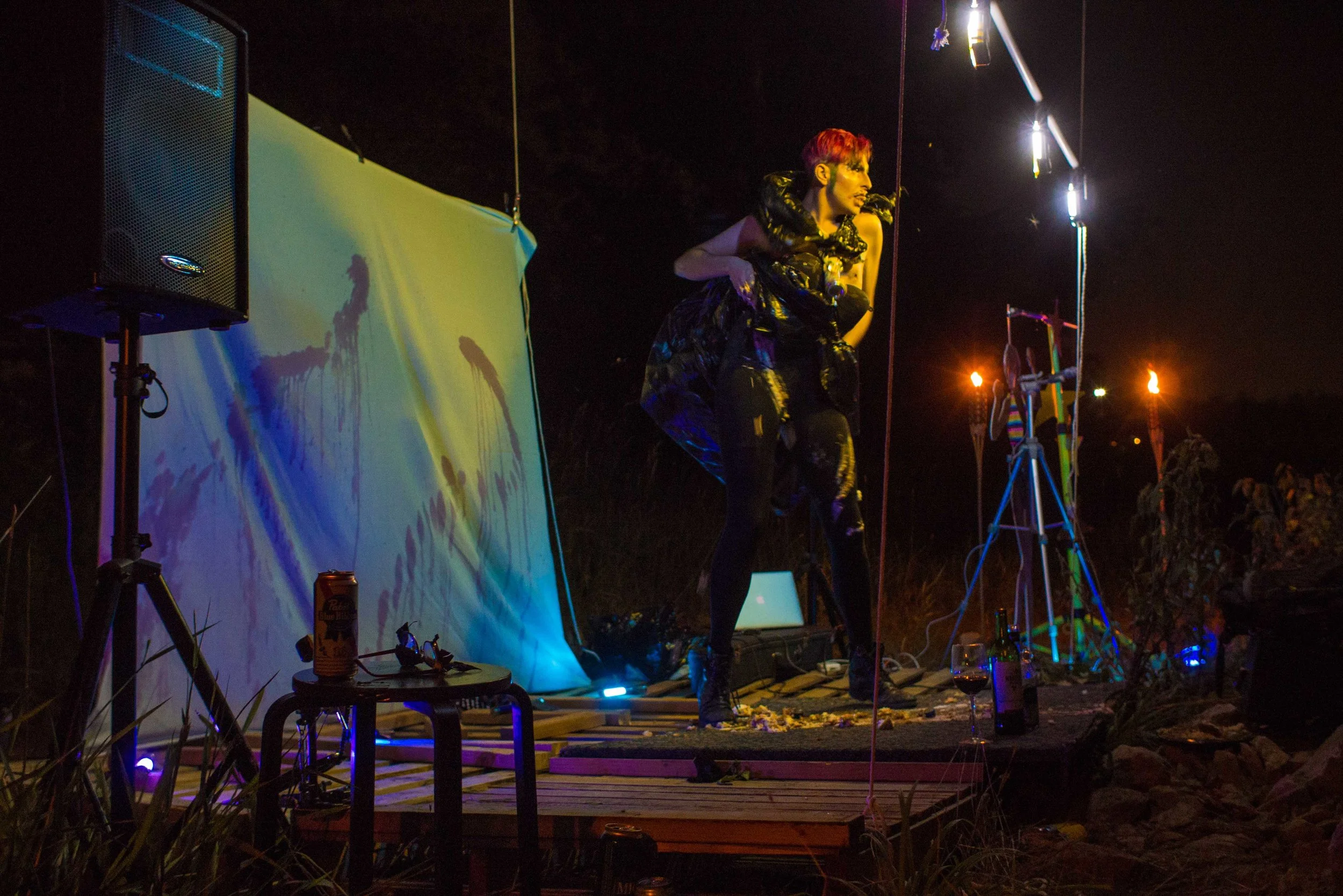 Set upon the rolling banks of the Kaw River under the belly of a derelict abandoned RR bridge BEASTS was a burlesque tribute to hobo culture. This multimedia collaborative event featured dueling banjo’s by Joseph Warren & Teri Quinn, 1960’s nudie cutie erotic shorts, and burlesque performance by the Velvet Valkyrie & Archimedes. Accompanied by golden go-go dancers spinning on broken record players and Bowie & Prince effigy the night came to a celebratory close with an impromptu wedding and cleansing fire.
