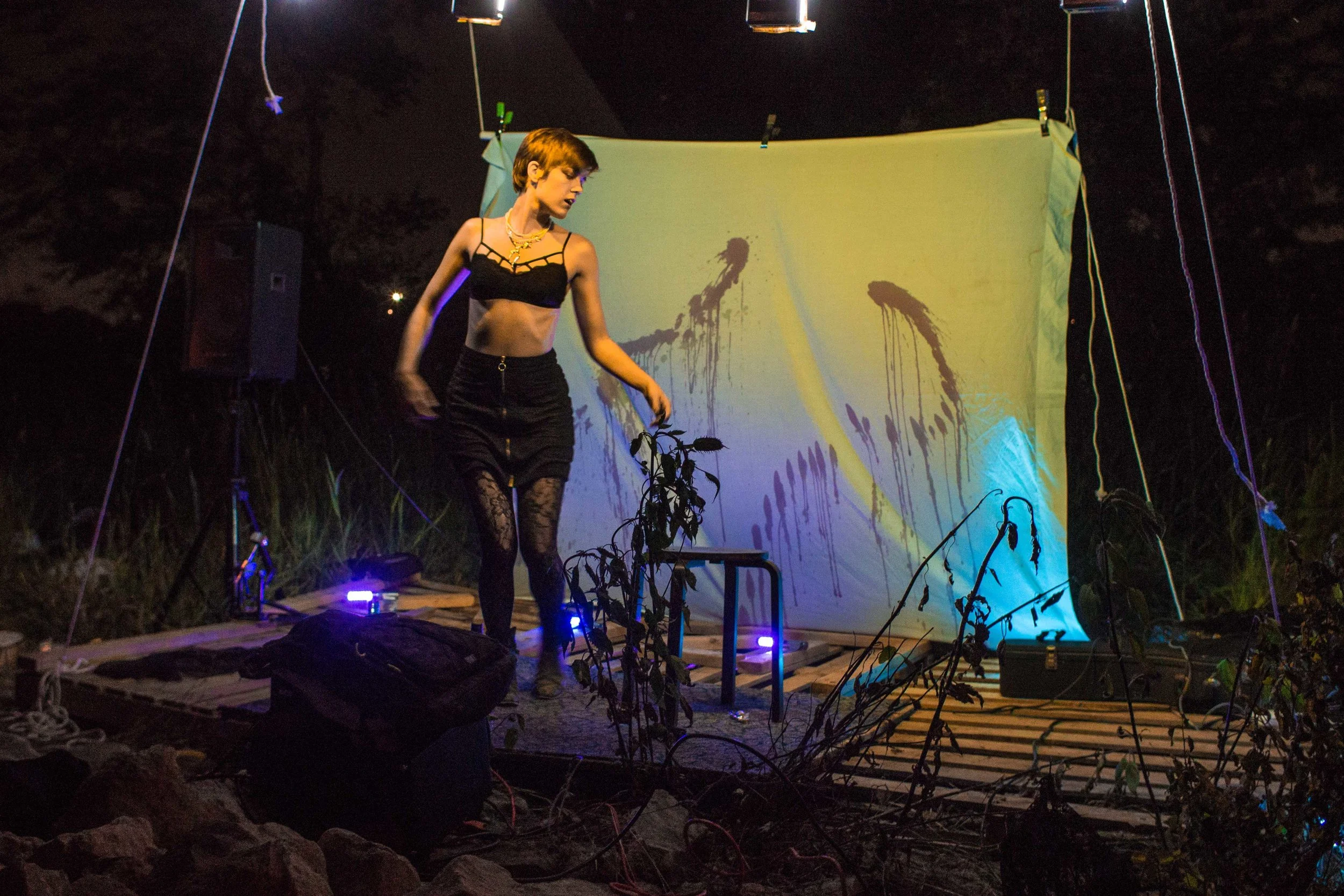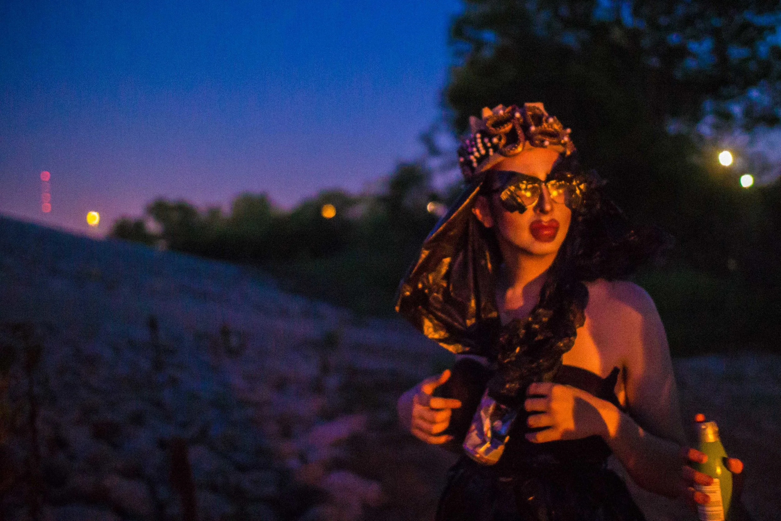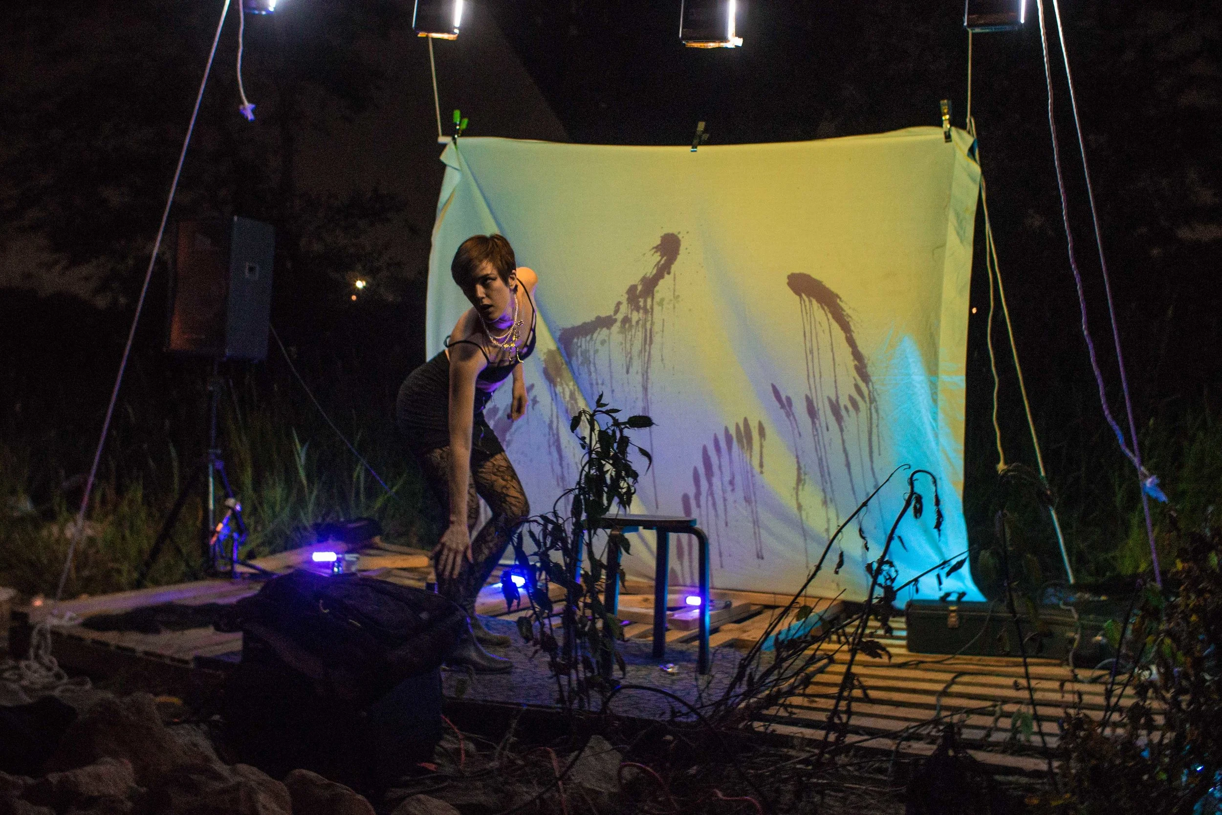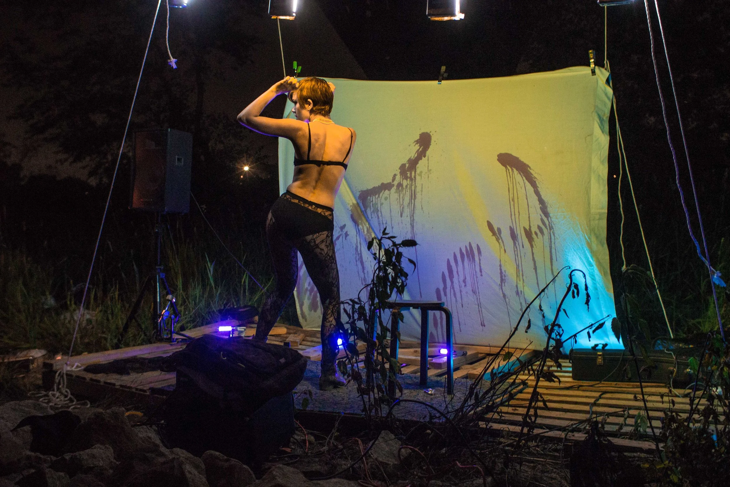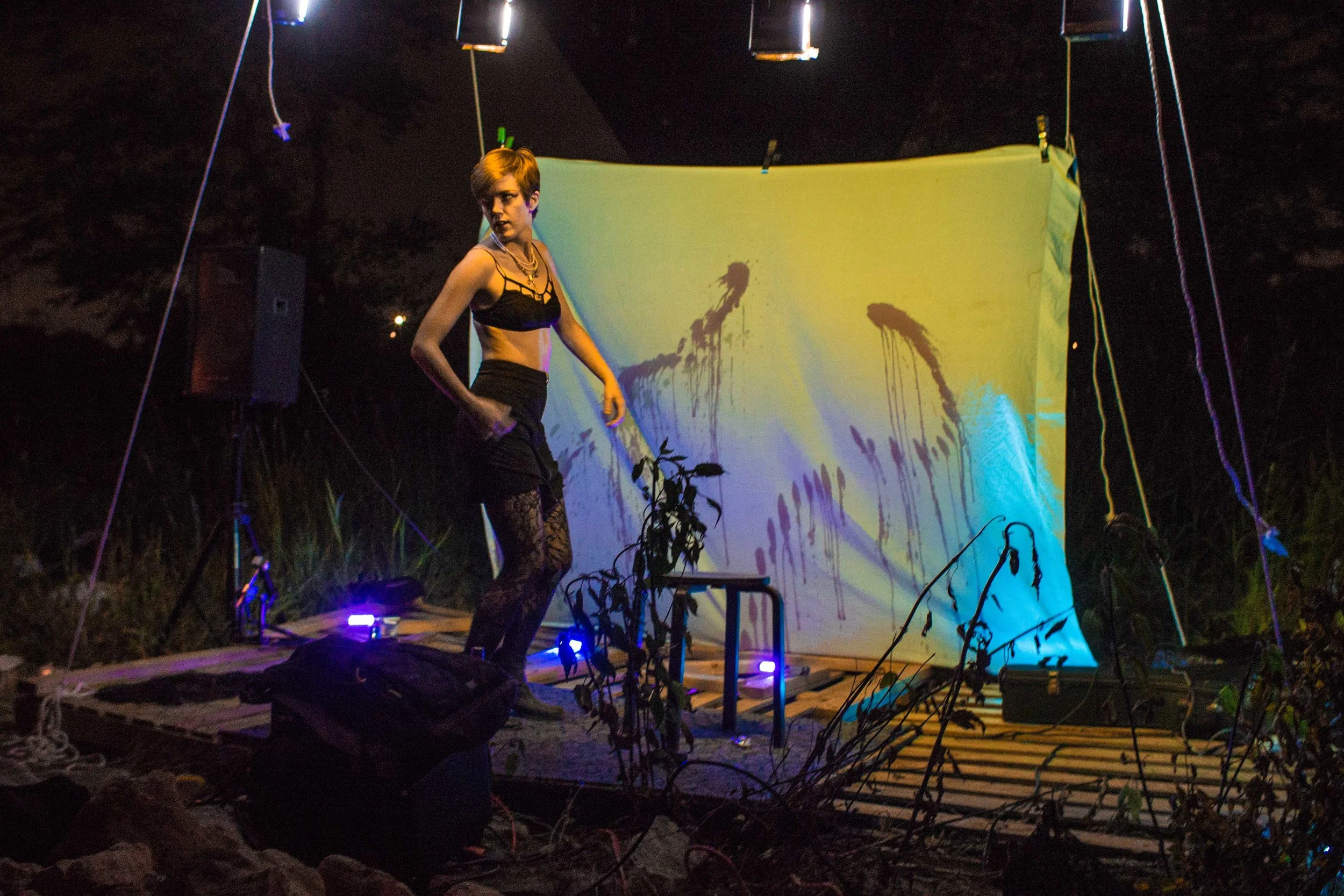 Set upon the rolling banks of the Kaw River under the belly of a derelict abandoned RR bridge BEASTS was a burlesque tribute to hobo culture. This multimedia collaborative event featured dueling banjo’s by Joseph Warren & Teri Quinn, 1960’s nudie cutie erotic shorts, and burlesque performance by the Velvet Valkyrie & Archimedes. Accompanied by golden go-go dancers spinning on broken record players and Bowie & Prince effigy the night came to a celebratory close with an impromptu wedding and cleansing fire.