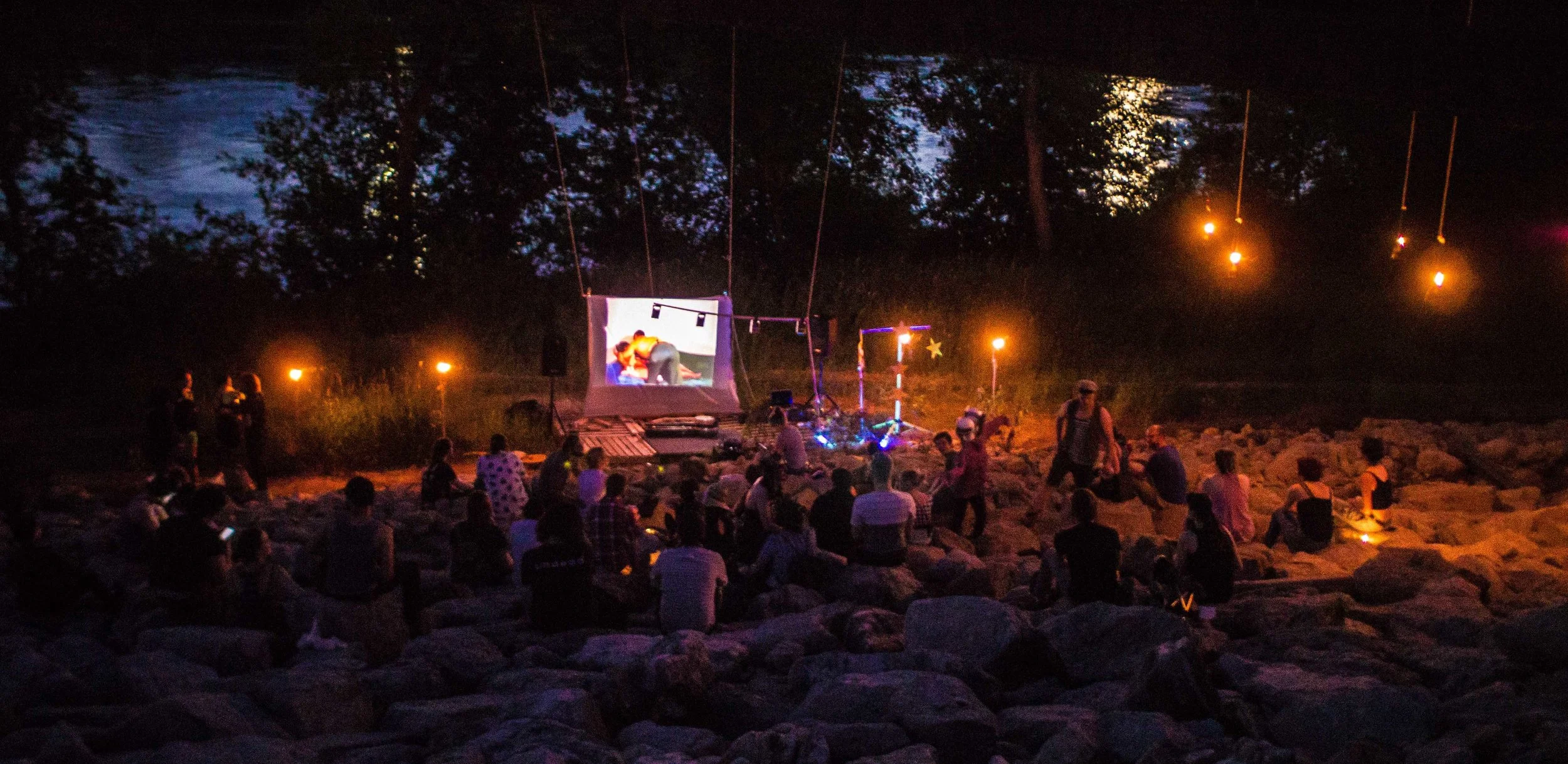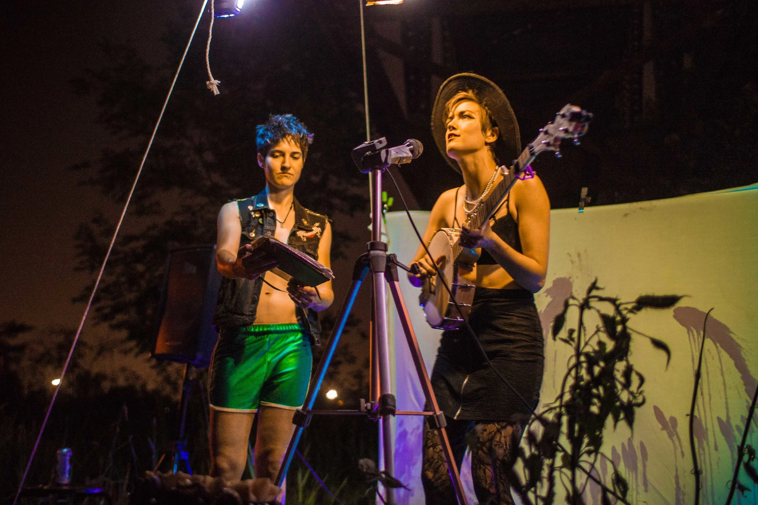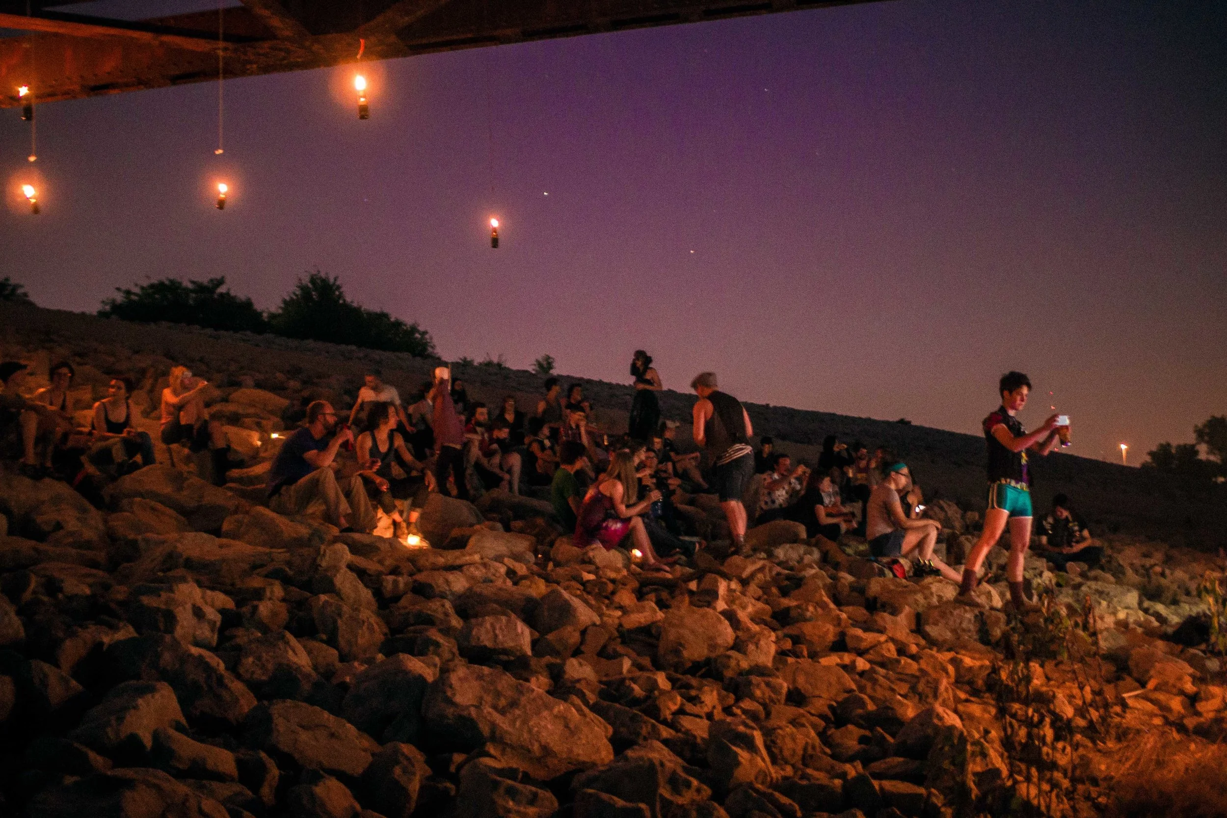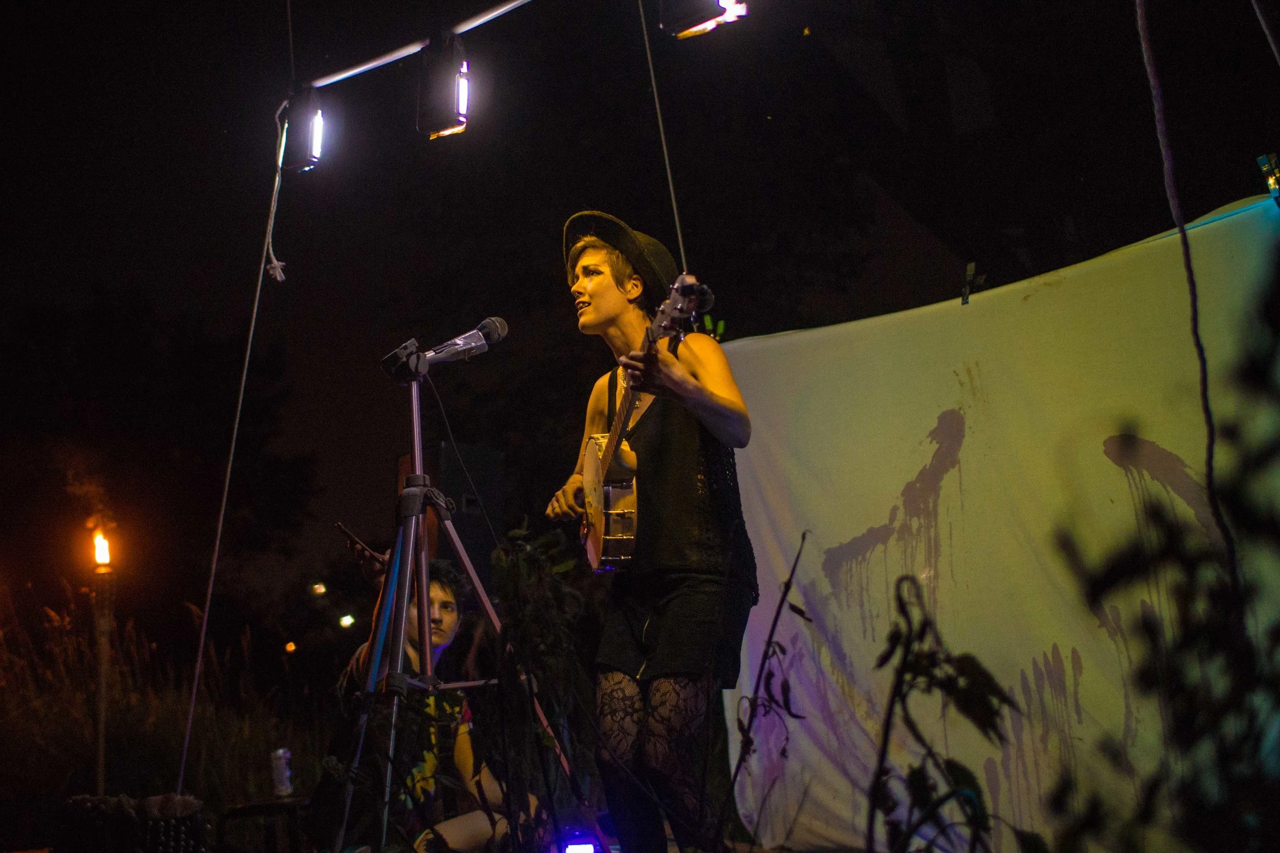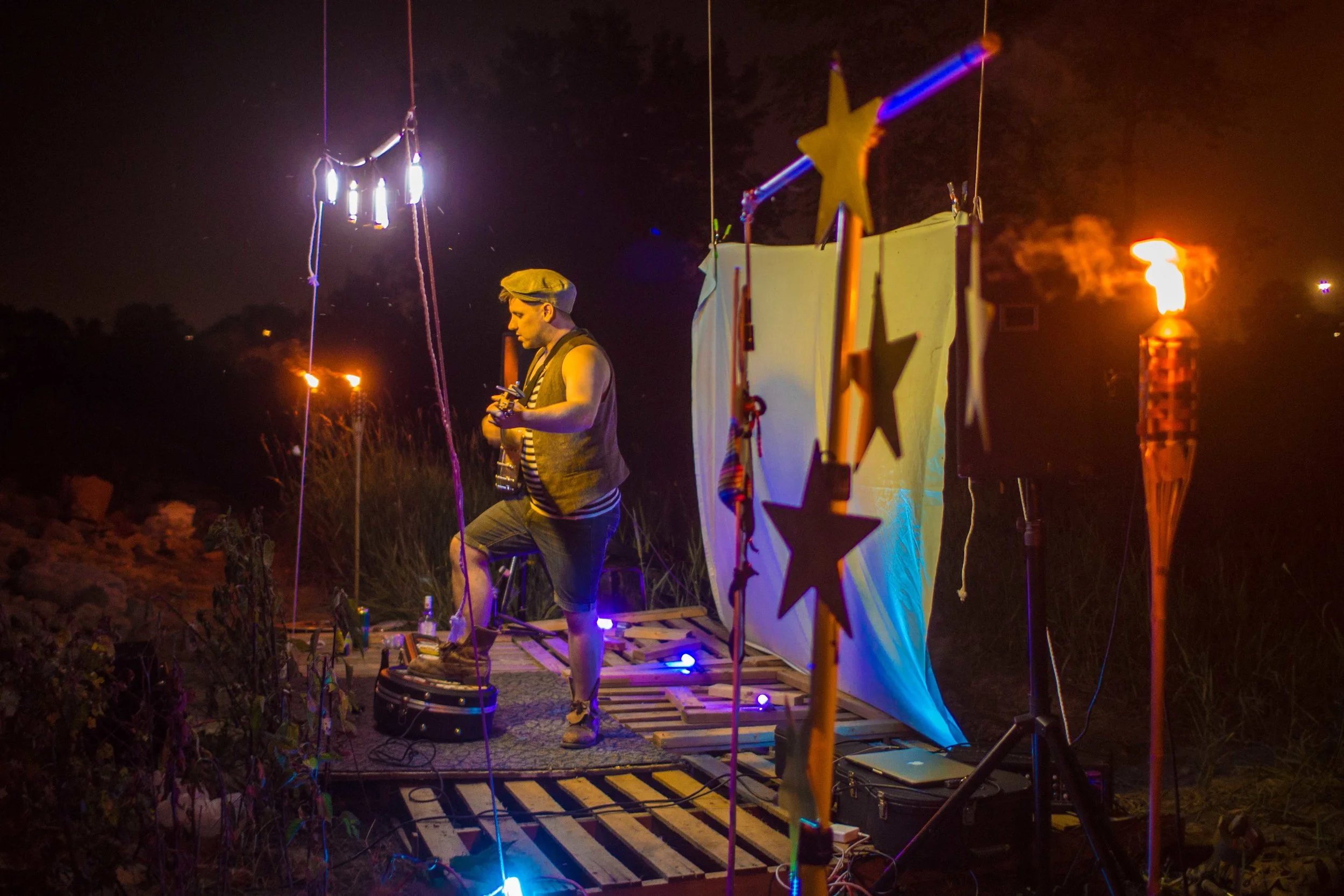 Set upon the rolling banks of the Kaw River under the belly of a derelict abandoned RR bridge BEASTS was a burlesque tribute to hobo culture. This multimedia collaborative event featured dueling banjo’s by Joseph Warren & Teri Quinn, 1960’s nudie cutie erotic shorts, and burlesque performance by the Velvet Valkyrie & Archimedes. Accompanied by golden go-go dancers spinning on broken record players and Bowie & Prince effigy the night came to a celebratory close with an impromptu wedding and cleansing fire.