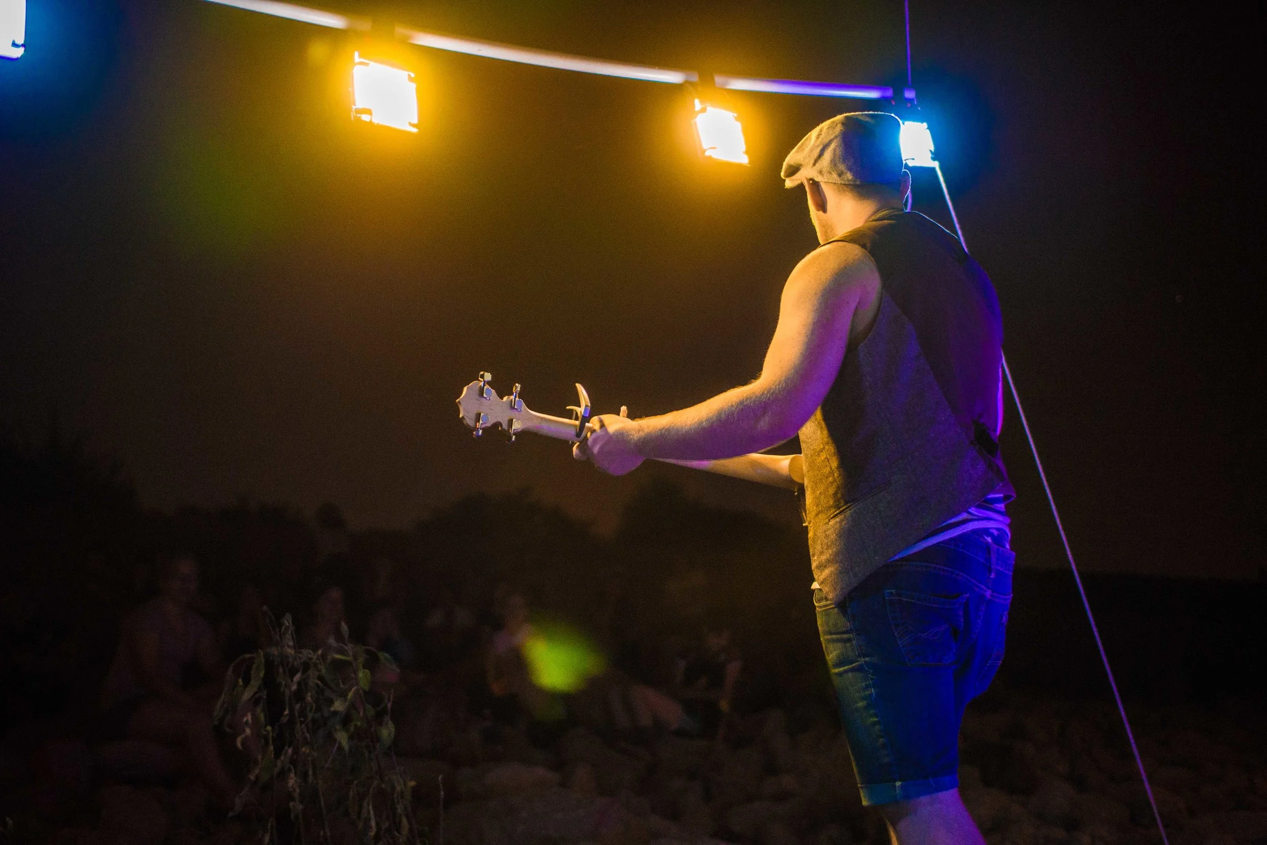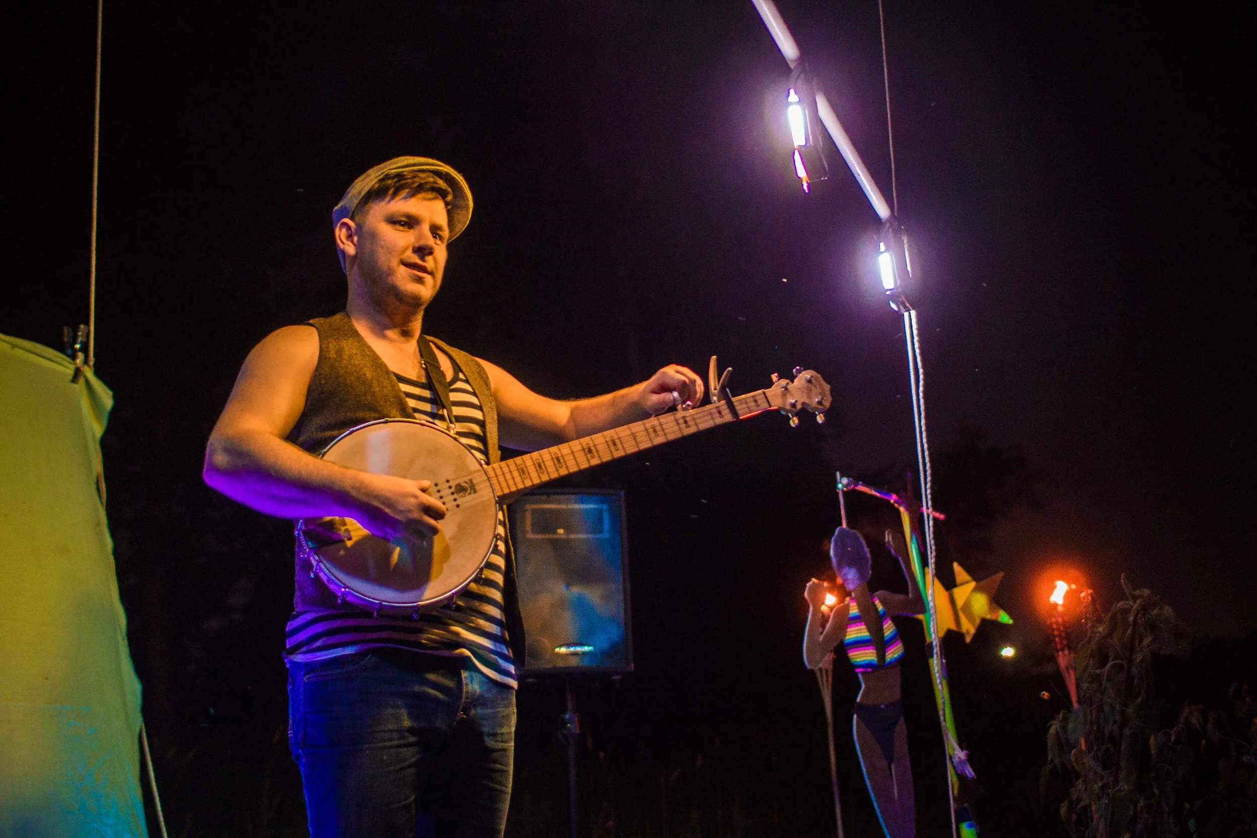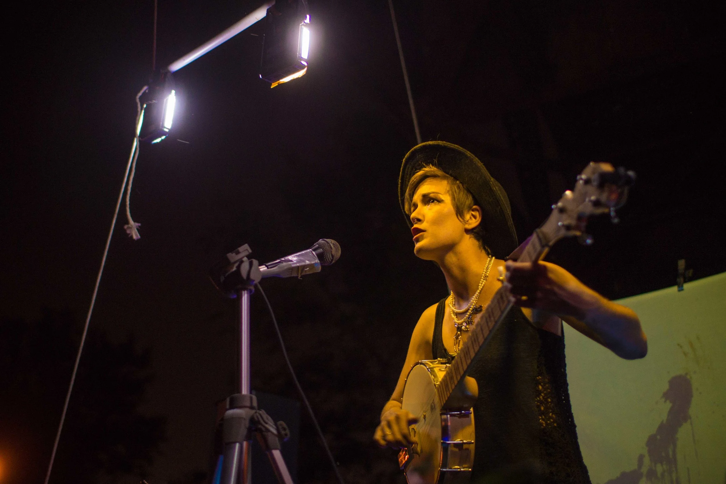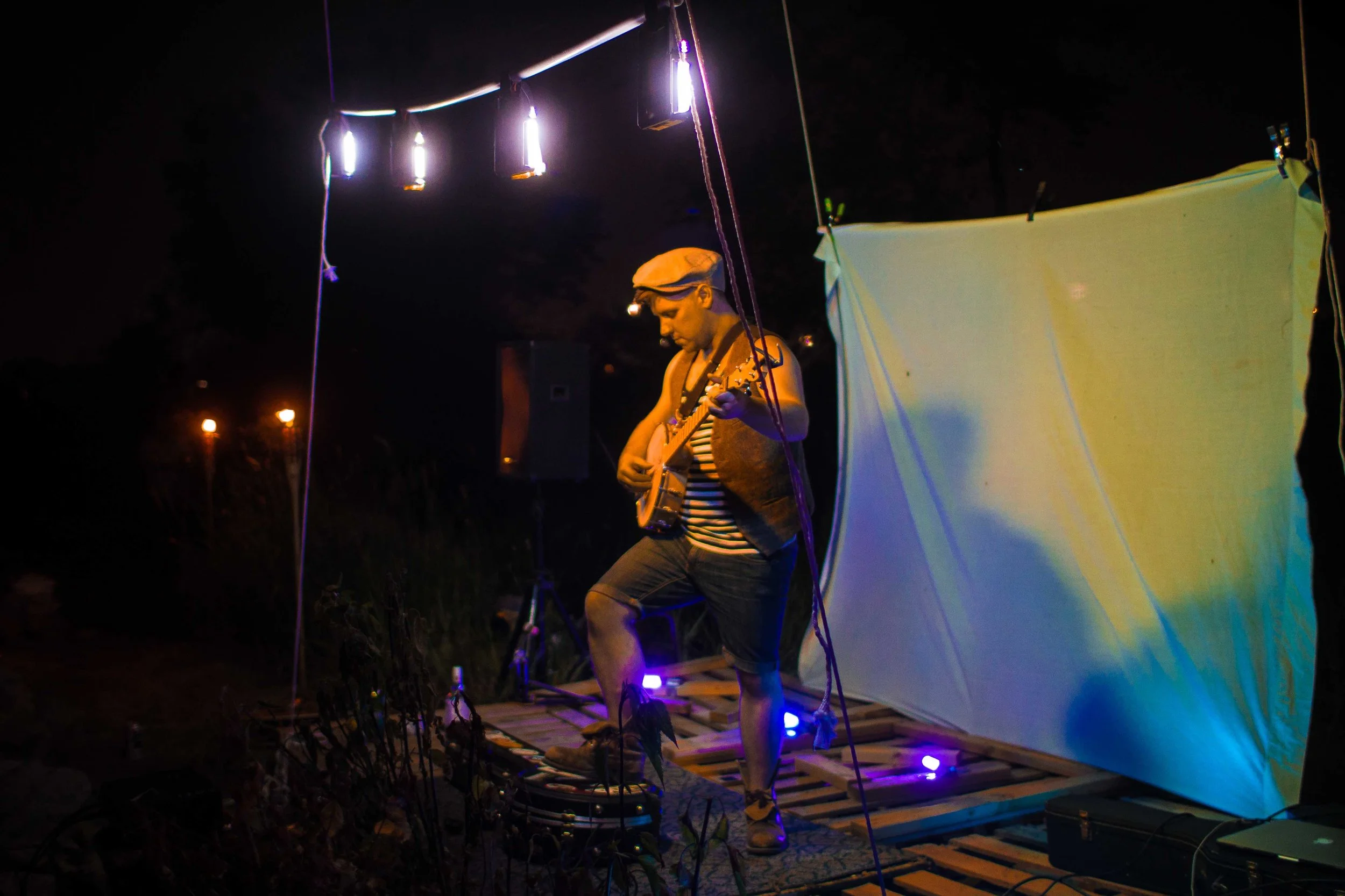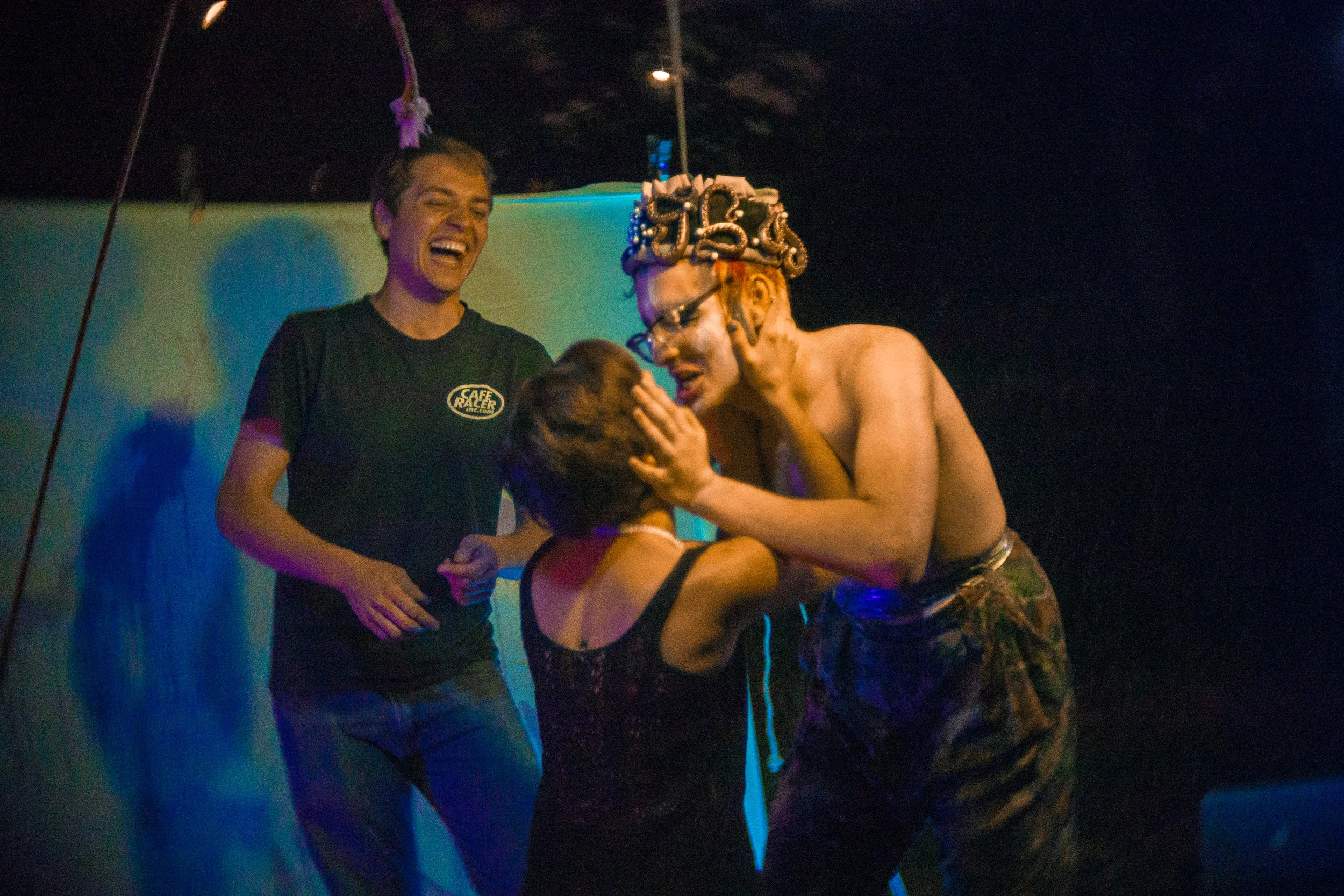 Set upon the rolling banks of the Kaw River under the belly of a derelict abandoned RR bridge BEASTS was a burlesque tribute to hobo culture. This multimedia collaborative event featured dueling banjo’s by Joseph Warren & Teri Quinn, 1960’s nudie cutie erotic shorts, and burlesque performance by the Velvet Valkyrie & Archimedes. Accompanied by golden go-go dancers spinning on broken record players and Bowie & Prince effigy the night came to a celebratory close with an impromptu wedding and cleansing fire.